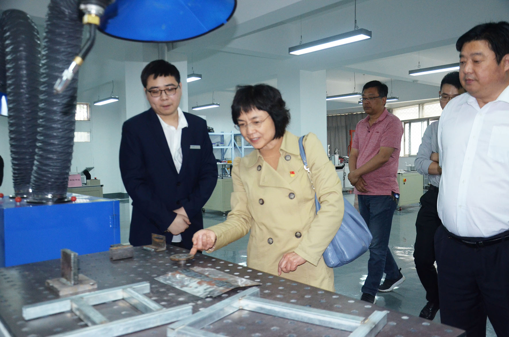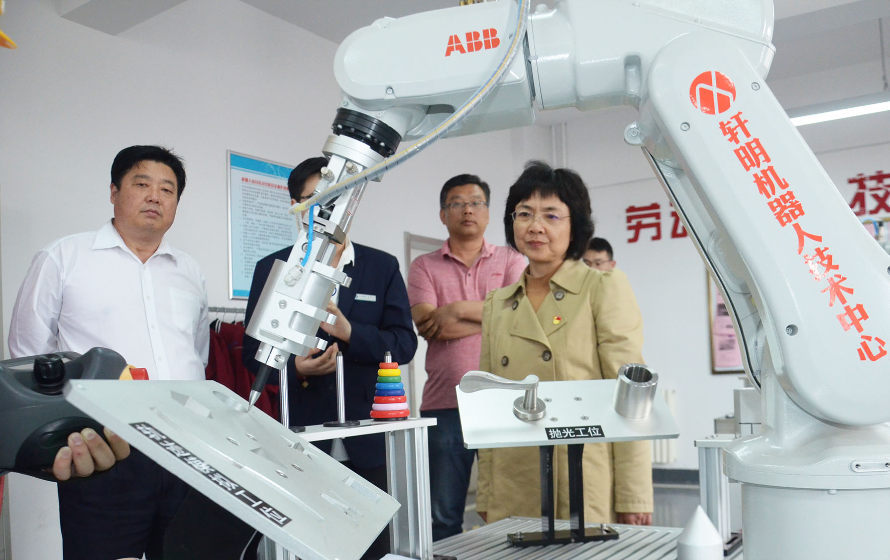 韦艳春在基地领导陪同下参观基地实训设备