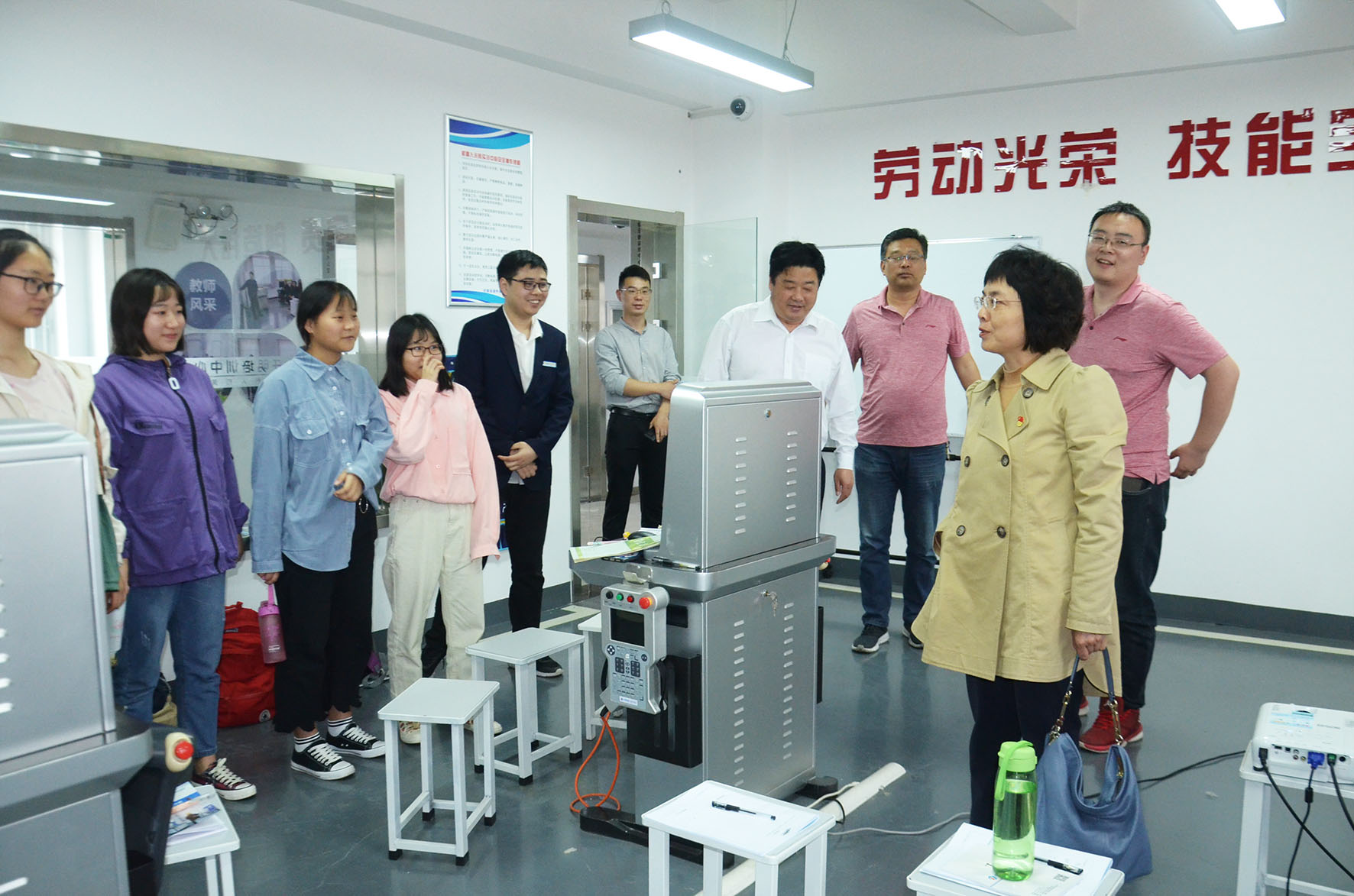 校长韦艳春在基地领导陪同下参观基地实训设备